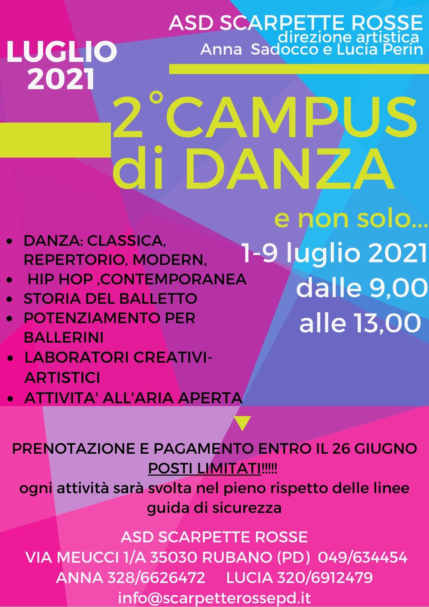 Un Campus di danza e non solo dal 1 al 10 luglio dalle 9.00 alle 13.00 (accoglienza dalle 8.30) Le attività saranno divise per fasce di età e si attiveranno con un minimo di 10 adesioni: 6-10 anni: · laboratori di danza: classica, modern, hip hop ·laboratori creativi-artistici ☺ · attività all’aria aperta ☼…