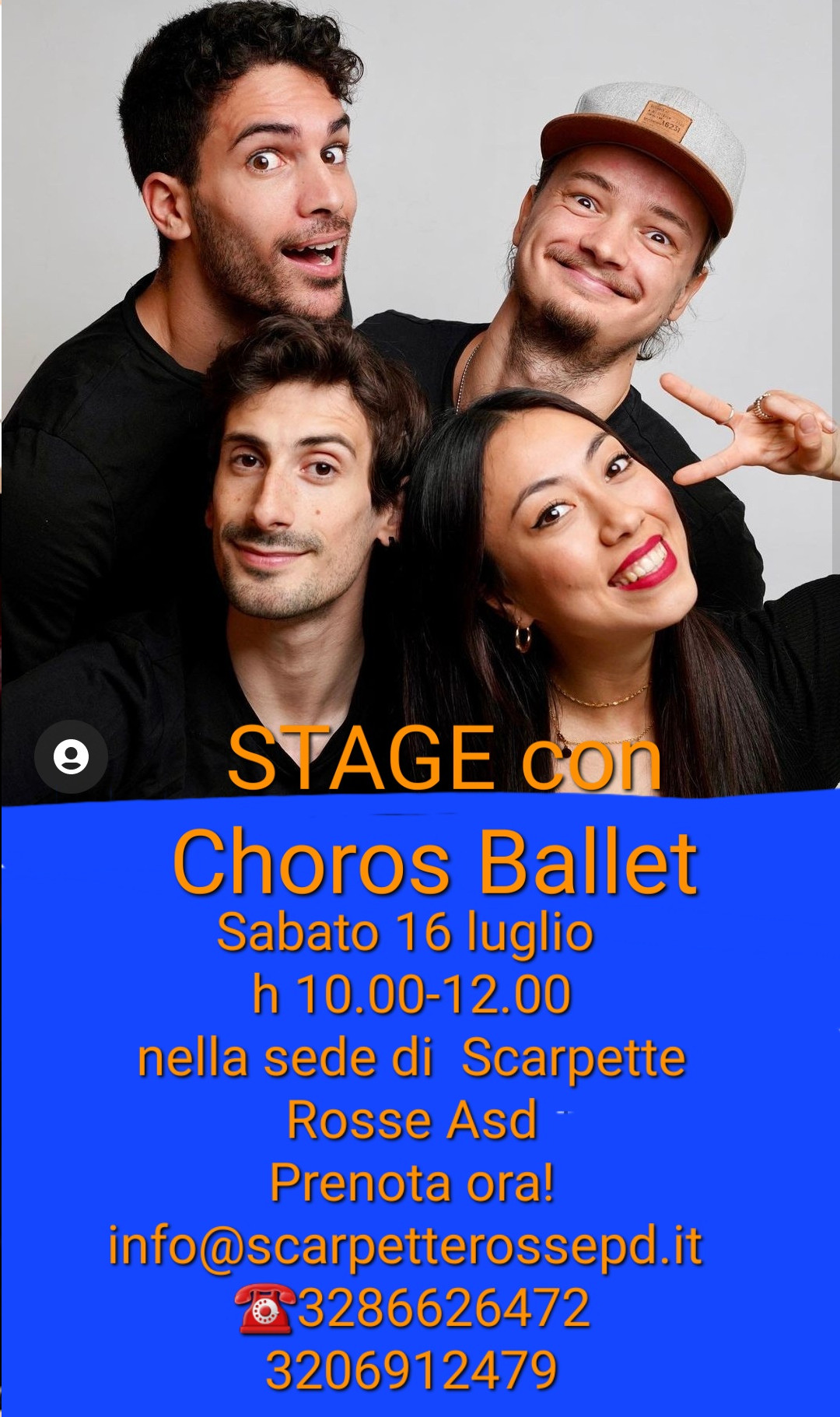Sabato 16 luglio dalle h 10.00-12.00 nella sede di Scarpette Rosse Asd a Rubano (PD) si terrà lo STAGE ESCLUSIVO con i CHOROS BALLET: Shinai Ventura, Tiziano Casu, Michele Prudente e Tim Stodieck vi aspettano per un laboratorio di danza nuovo, spontaneo, originale. Prenota ora! 📧info@scarpetterossepd.it ☎️3286626472/3206912479 Vi invitiamo a non mancare!