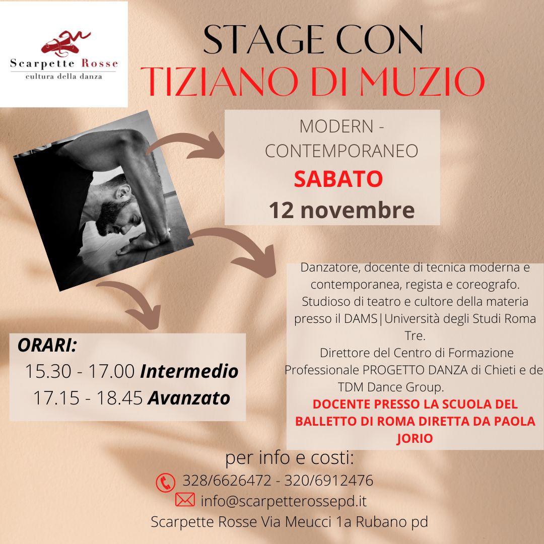 Nuovo evento di DANZA a PADOVA: STAGE di MODERN CONTEMPORANEO con Tiziano Di Muzio, danzatore, docente di tecnica moderna e contemporanea, regista e coreografo. Studioso di teatro e cultore della materia presso il DAMS | Università degli Studi Roma Tre. Direttore del Centro di Formazione Professionale PROGETTO DANZA di Chieti e de TDM Dance Group. Docente presso la Scuola del Balletto di…